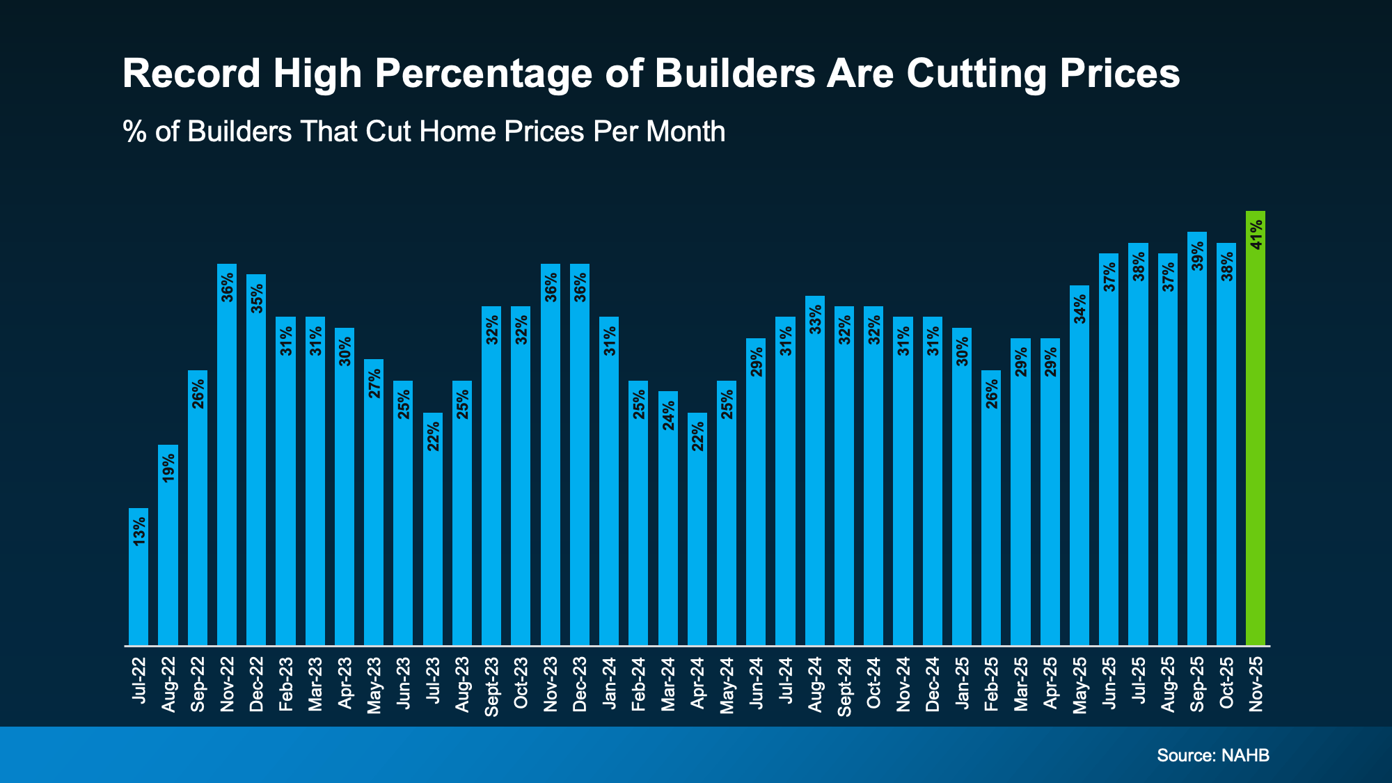These incentives are widespread. According to the National Association of Homebuilders, 65% of builders are currently offering some type of sales incentive, and in November, 41% reported cutting prices, the highest level seen in the post-COVID era.